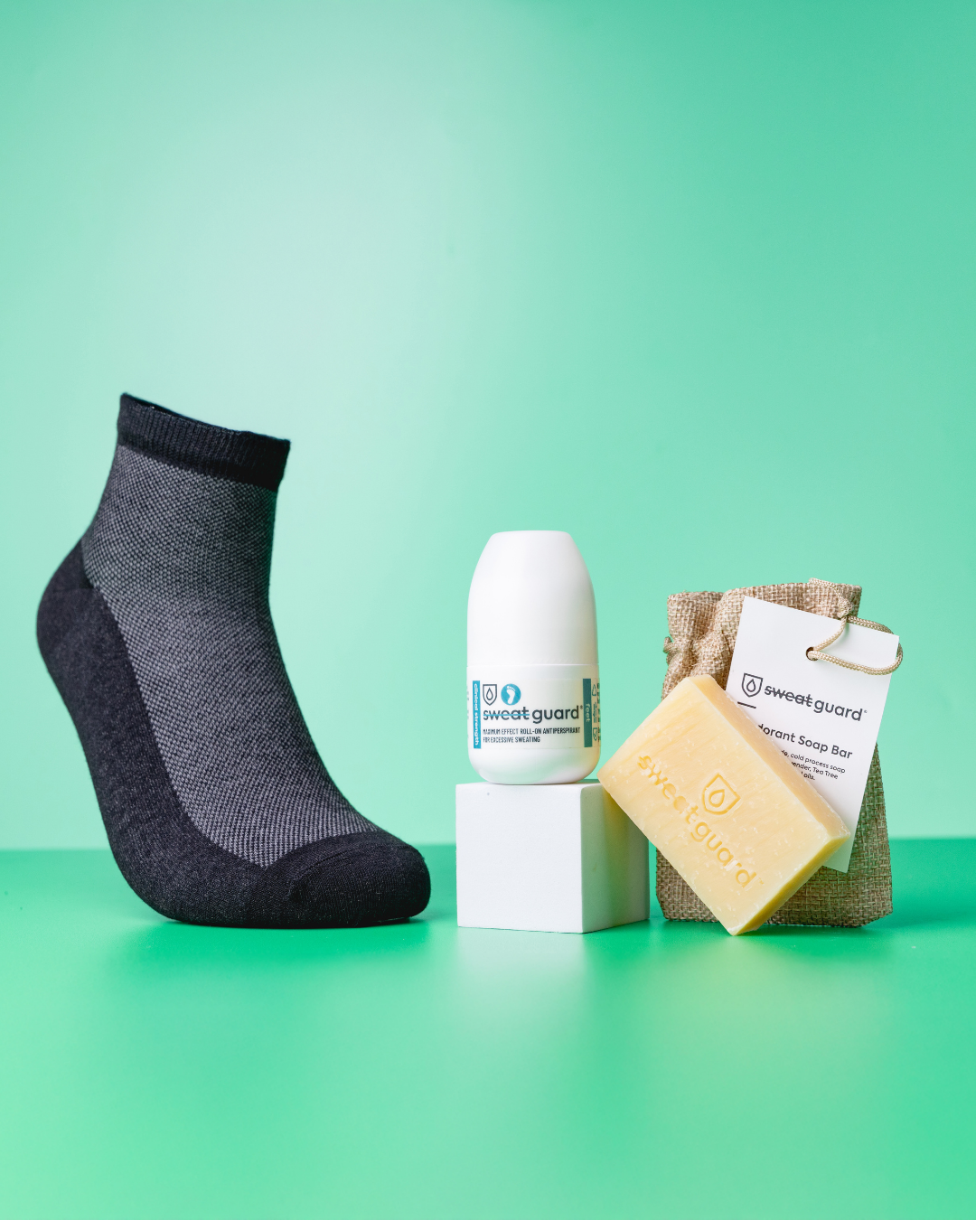 Our feet antiperspirant stops both extreme excessive sweating and foot odour. While the antimicrobial Silver Fibres in our socks inhibit micro-organism growth, killing odour-causing bacteria and fungi.